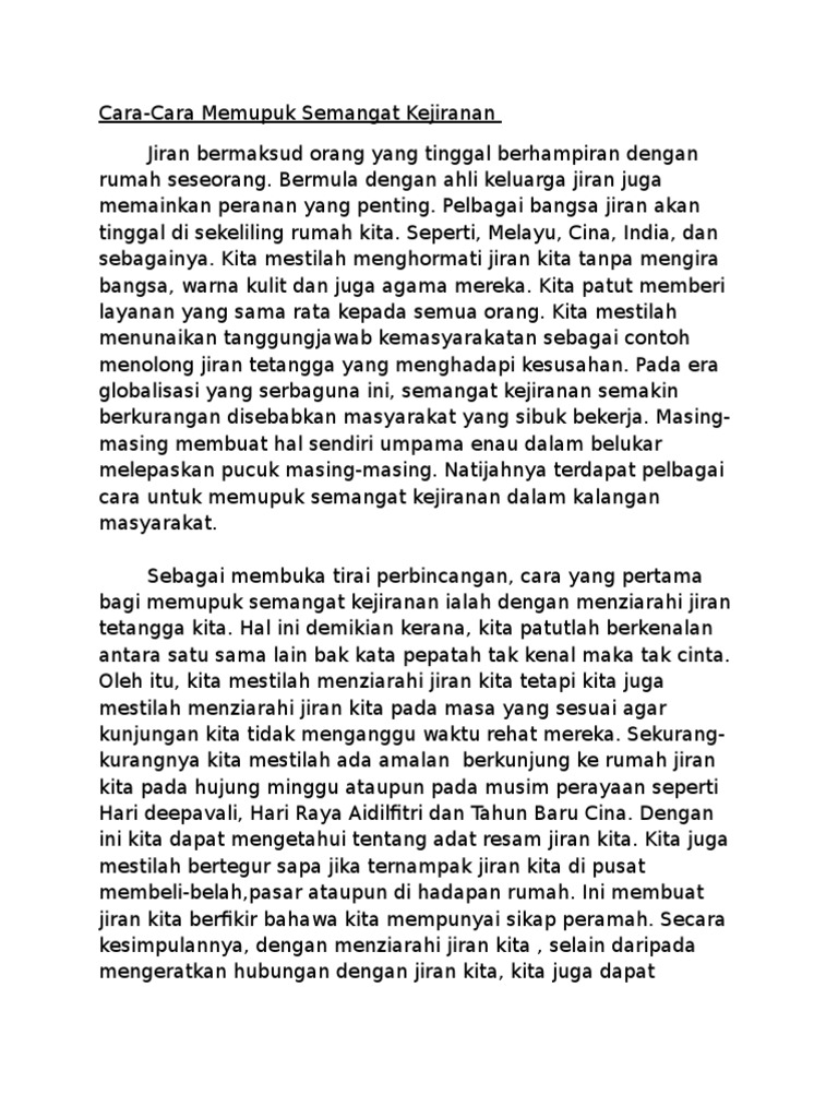 Dec 16 2016 Oleh itu langkah-langkah yang wajar hendaklah diambil untuk memupuk semangat kejiranan dalam kalangan penduduk setempat. Aug 05 2014 Ulasan 1 - Semangat Kejiranan. Baca petikan di bawah dengan teliti kemudian buat satu rumusan tentang faedah-faedah hidup berjiran dan cara-cara memupuk semangat kejiranan.